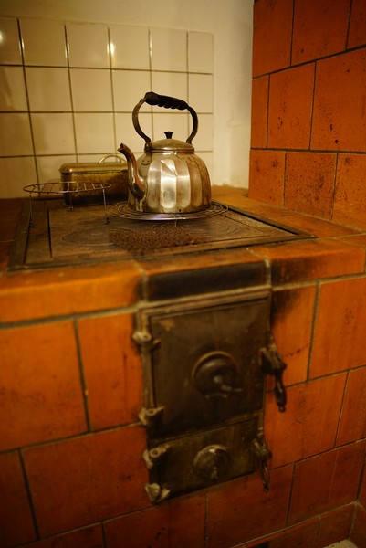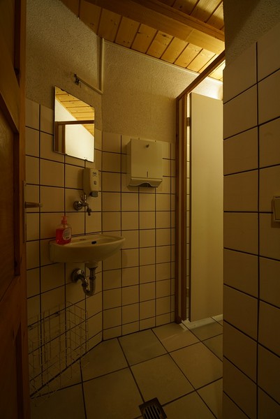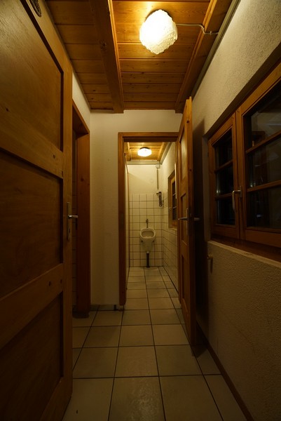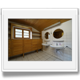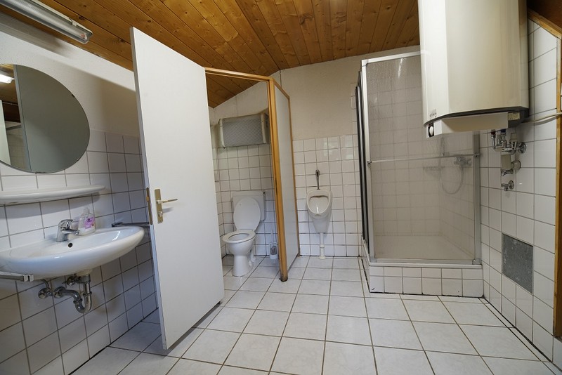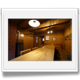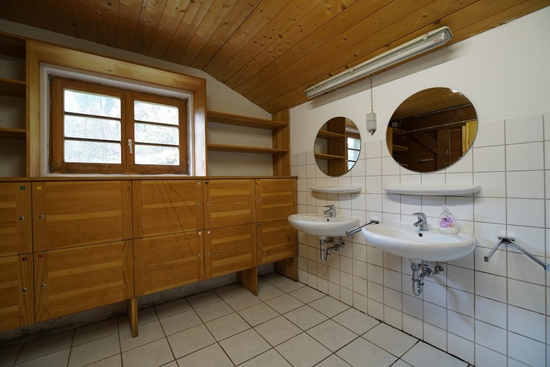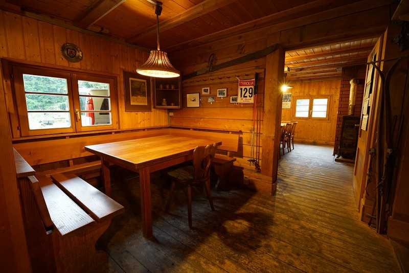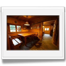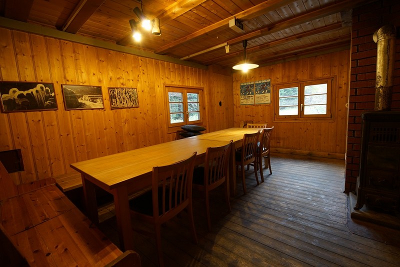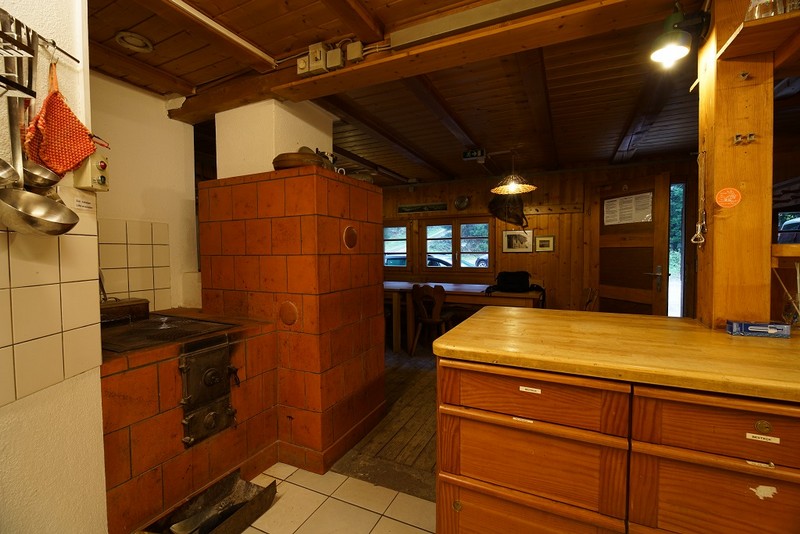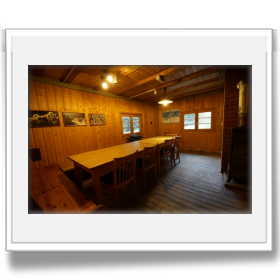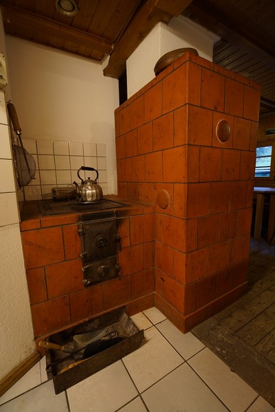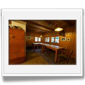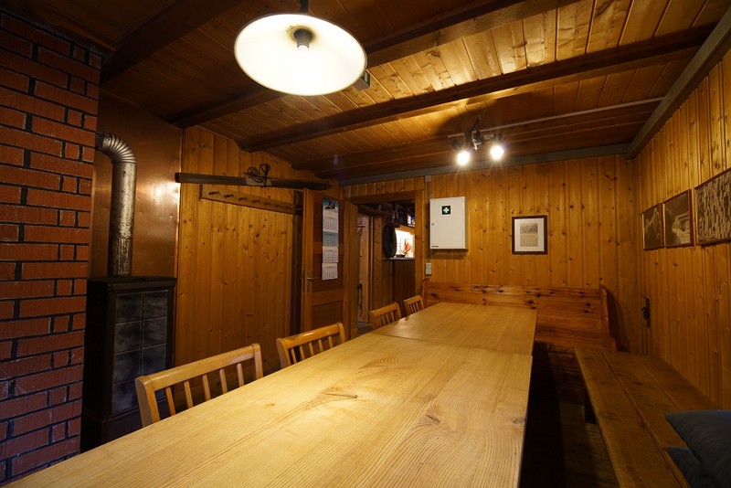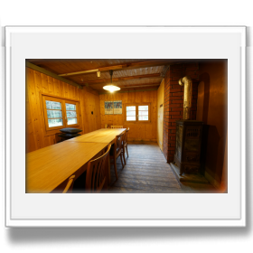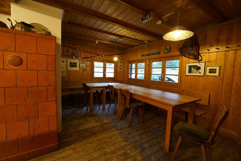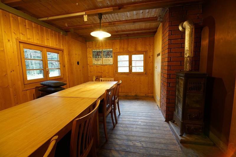 Kleiner Aufenthaltsraum: Tische und Bänke für ca 10 Personen, Ofen.