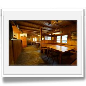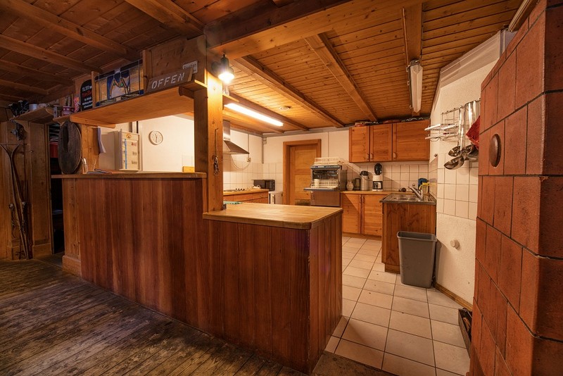 Großer Aufenthaltsraum: Tische und Bänke für ca. 20 Personen, Regale, Kachelofen.