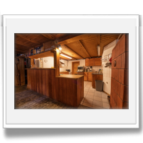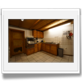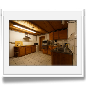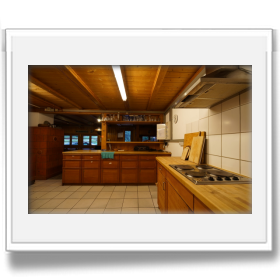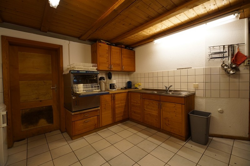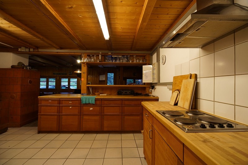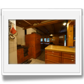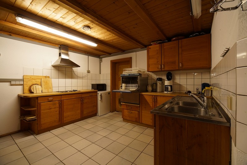 Küche: offen zum großen Aufenthaltsraum, Elektroherd, elektr.Boiler, Geschirrspüler, Kühlschrank, Holzherd, Kaffeemaschine, Wasserkocher, Mikrowellengerät; Eß-, Trink- und Kochgeschirr, sowie Besteck in ausreichender Menge verfügbar.